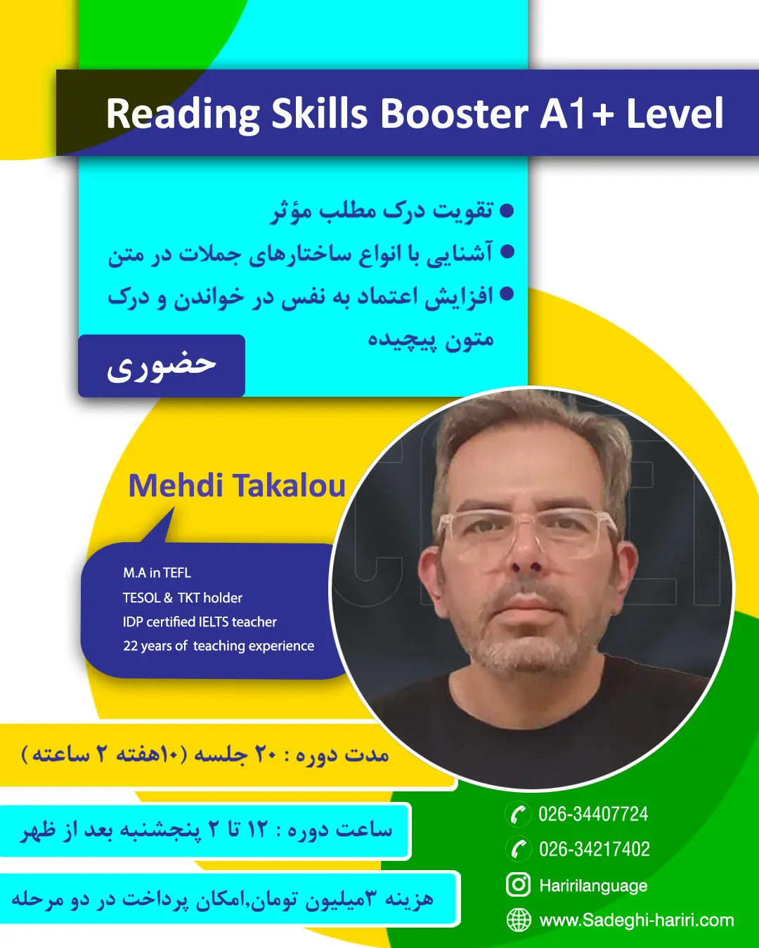 دوره آموزش زبان انگلیسی آنلاین صادقی حریری در آموزشگاه زبان انگلیسی کودکان در کرج در دورههای نیمه خصوصی و دوره های عمومی (به صورت محدود) برگزار می شود. زبان آموزان از سنین ۵ سال به بالا توانایی شرکت در دوره های آنلاین را خواهند داشت.